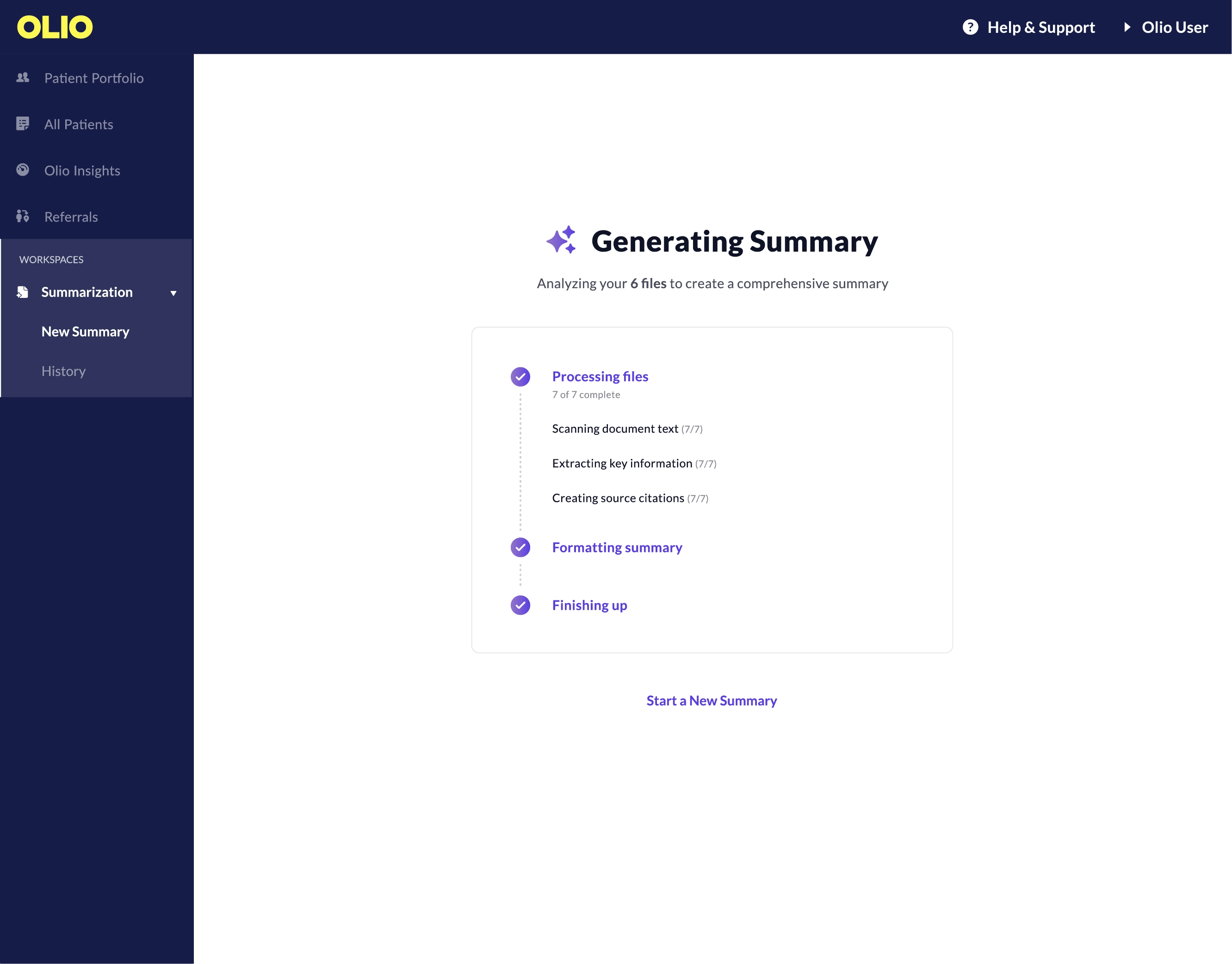 Healthcare workers are drowning in administrative chaos, bottlenecked by having to sift through several pages of documentation. Olio's Summarization Workspace transforms this process by condensing clinical records into a single, clear summary of the most essential information.
